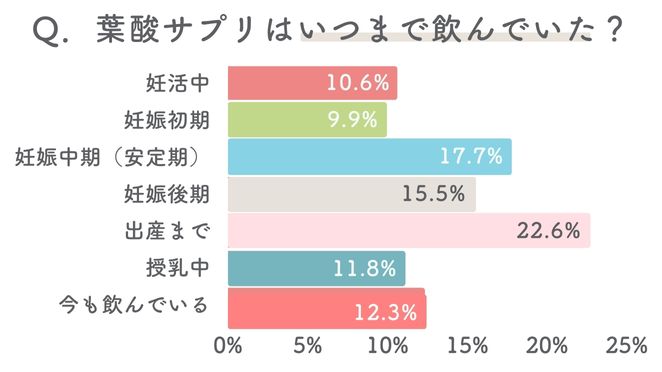 一方、妊活・妊娠経験者の女性680人に「いつまで葉酸サプリを飲んでいたか」をアンケートで聞いたところ、妊娠中期から出産まで葉酸サプリを飲み続けていた人が比較的多い結果になりました。