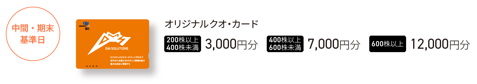 中間・期末基準日 200株以上~400株未満 半年継続保有 クオ・カード 3,000円分 400株以上~600株未満 半年継続保有 クオ・カード 7,000円分 600株以上 半年継続保有 クオ・カード 12,000円分 毎年3月31日及び9月30日現在の当社株主名簿に記載または記録された、当社株式を200株以上、半年以上継続保有※されている株主様を対象といたします。
